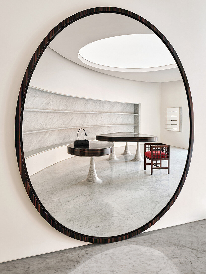 La façade en marbre de Carrare se présente comme une surface monolithique traversée par des ouvertures circulaires et arrondies qui réinterprètent les motifs perforés iconiques d’Alaïa.